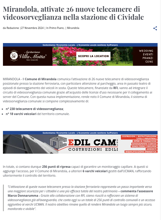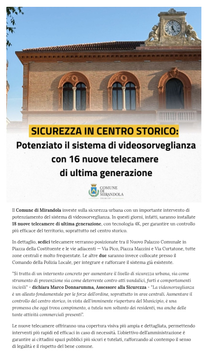 Ma la questione diventa ancora più interessante quando si guarda da dove viene tutto questo. Perché una buona parte di questo grande impianto raccontato come novità abbagliante non nasce dal nulla. Non è che fino a ieri Mirandola fosse cieca e oggi abbia aperto gli occhi. Una parte consistente delle telecamere c’era già, era già installata, era già operativa dentro un sistema precedente. Il nuovo impianto, più che una creazione, è una riorganizzazione: smonta, sostituisce, integra, ricompone. E poi prende questo insieme complesso e lo restituisce sotto forma di numero unico, pulito, perfetto per essere raccontato.